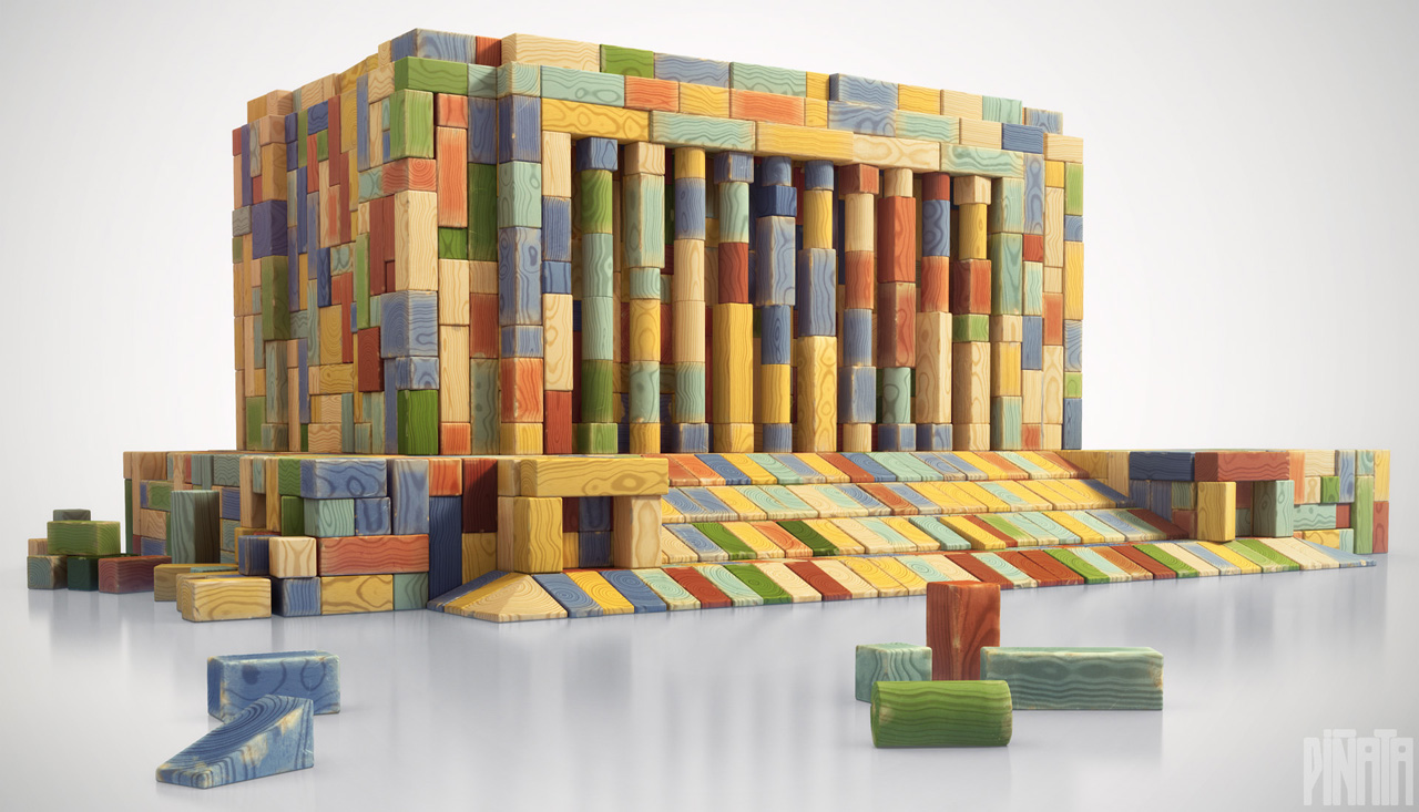Something I did at Piñata. Done in 3ds max and rendered it with VRay. The wood material is my own procedural BerconWood map. I randomized the materials with maxscript so each block is unique. Worn look was achieved by rendering mask of the block edges and then mixing plain wood material using this the mask in post. Composition done in Photoshop by Tuomas Korpi.