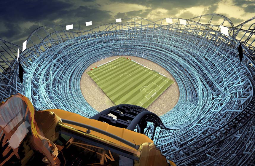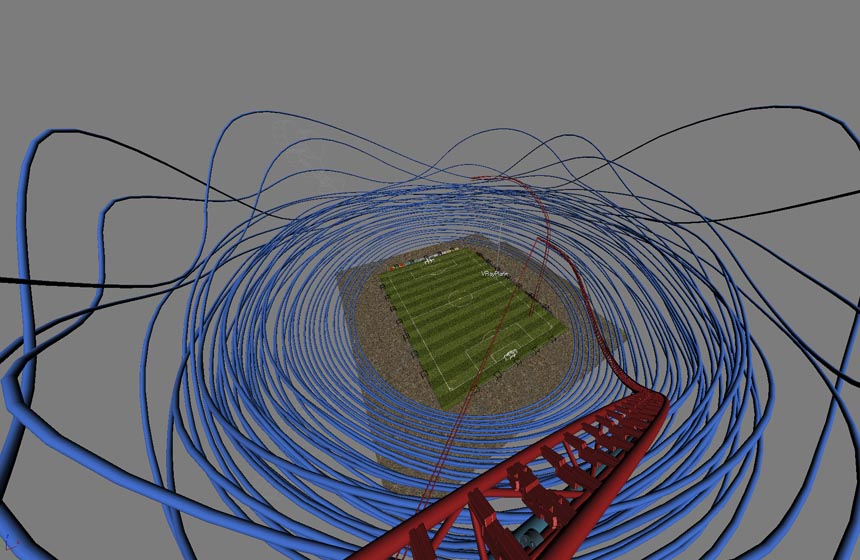 With this image, most of the credit goes to people at Piñata. I was only responsible for some maxscripting. Modeling the rollercoaster by hand would have taken ages, so I was tasked to create it entirely with maxscript. I think it came out pretty convincing. The script takes out the control splines (Picture #2) and generates the whole rollercoaster based on them completely automatically (Picture #3).