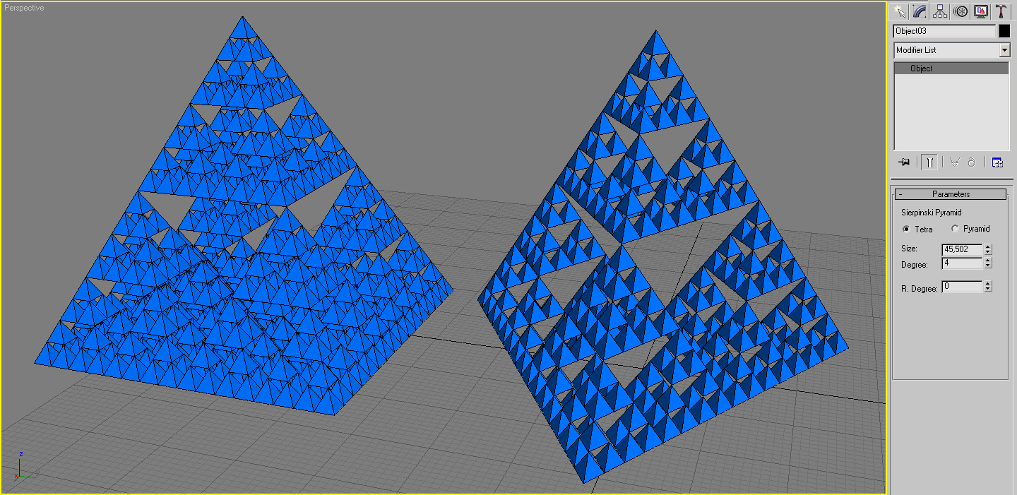 Classic Sierpinski Pyramid fractal object for max. You can adjust size, degree (supports different degree for render) and type (tetras and pyramids). Works only in 3ds max 9 32bit.